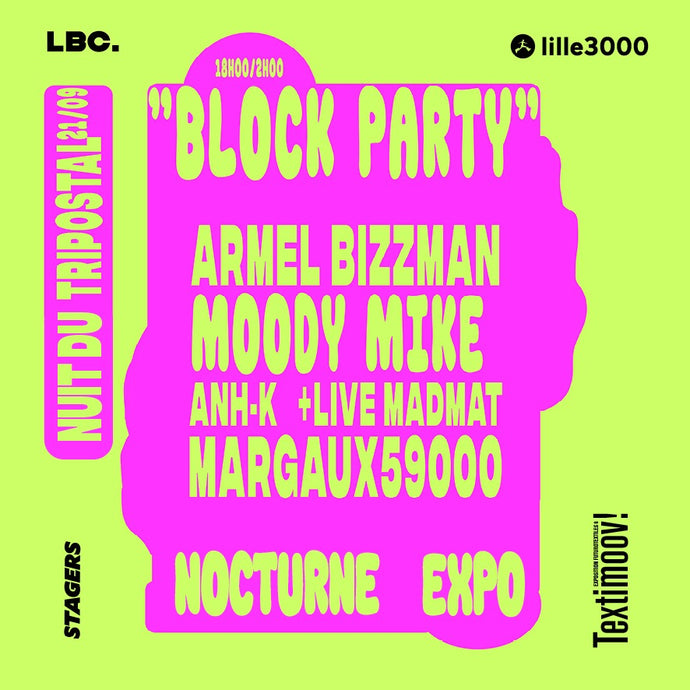 Dernière Nuit du Tripostal dans le cadre de l'exposition "Textimoov!" avec LBC et lille3000 !LBC et lille3000 s’associent pour vous offrir une dernière Nuit du Tripostal 100% gratuite, avec en prime une nocturne de l'exposition Textimoov! avant sa fermeture le 29 septembre prochain. Au programme :> Warm up dès 18h00> Puis place à un Live exceptionnel de Madmat suivi de DJ sets explosifs avec Anh-K, Margaux59000 et ensuite on part en grosse teuf enflammée avec Moody Mike et Armel Bizzman !Peu importe vos goûts musicaux, que vous soyez amateurs électro, d’afrobeat, de deep house de disco, de dancehall ou de hip-hop, il y en aura pour tout le monde.Et la meilleure partie ? L’entrée à la soirée (hors expo) est gratuite, alors aucune excuse pour ne pas venir vous éclater !